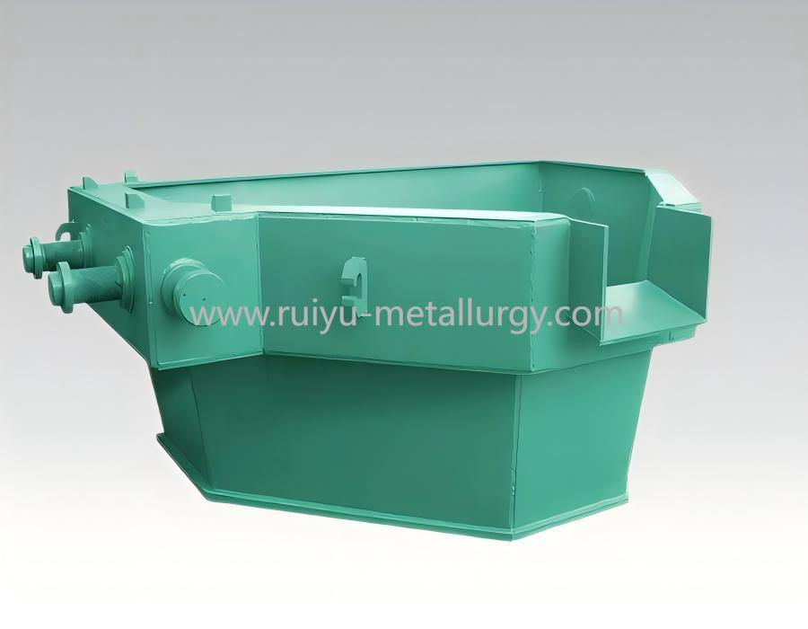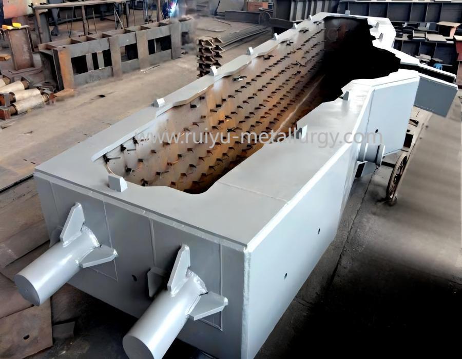 Intermediate ladle body: welded from steel plate, lined with refractory material, with a water outlet at the bottom.